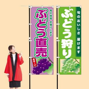 当店は、のぼり旗の総合販売サイト「のぼりストア」から、ぶどう直売所様向けに特化し、より専門性の高い販促をご提案するサイトです。ぶどう直売所様専用の商品を開発し、他店には無い高いクオリティのラインナップをご用意しております。また、ぶどう直売所様に向けたお役立ち情報などをまとめておりますので、販促用品ともどもご利用ください。お客様のお店の商売繁盛に少しでもお役に立てれば幸いです。
