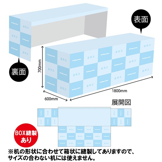 テーブルカバーは「BOX仕立て」という箱型に縫製されている商品で、テーブルに被せて使います。下記のサイズ(幅1800mm×高さ700mm×奥行450mm または 600mm)に適合するテーブルに使用することができます。予めお使いのテーブルサイズがわかっている場合は、こちらがおすすめです。